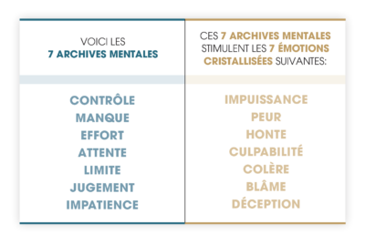 Dans ce 2e exemple, nous ajoutons 4 archives mentales (contrôle, jugement, impatience, manque) combinées à 2 émotions cristallisées (peur, impuissance).